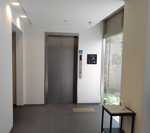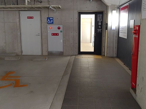 あわせて通路の段差部分と入口扉から美術館受付まで、視覚障害者誘導ブロックを設置しております。1階の入口扉は自動扉です。2 - 地階の来館者用駐車場では、エレベーターホール入口に一番近い区画を障害者等用駐車区画にしております。入口扉は手動です。6