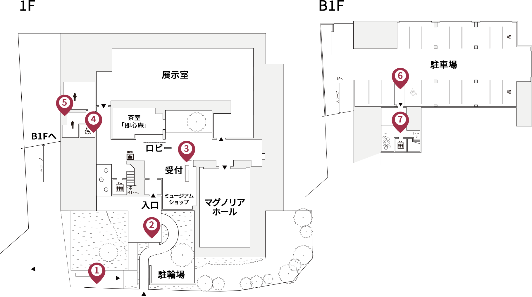 1階へは車いす対応のエレベーターを設置しておりますのでご利用ください。7 - 展示室、ミュージアムショップ、茶室「即心庵」、マグノリアホールは1階にございます。1階に段差はございません。