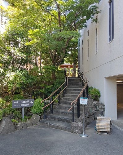 - 来館者用駐車場から記念館受付へは、15段の屋外階段を上がるか、いったん前面道路(登り坂)に出て長屋門から入ってください。 1 2