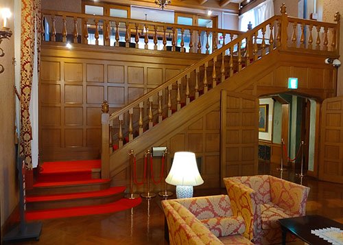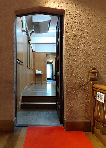 - 雅俗山荘の2階展示室へは18段の室内階段のみとなります。3段目の踊り場から上には手すりを設置しております。