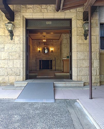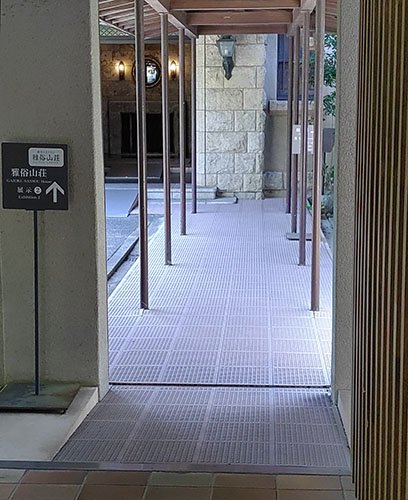 - 雅俗山荘の玄関扉は開放しております。玄関には段差があり、2か所スロープを設置しております。展示室への内扉は手動です。 6