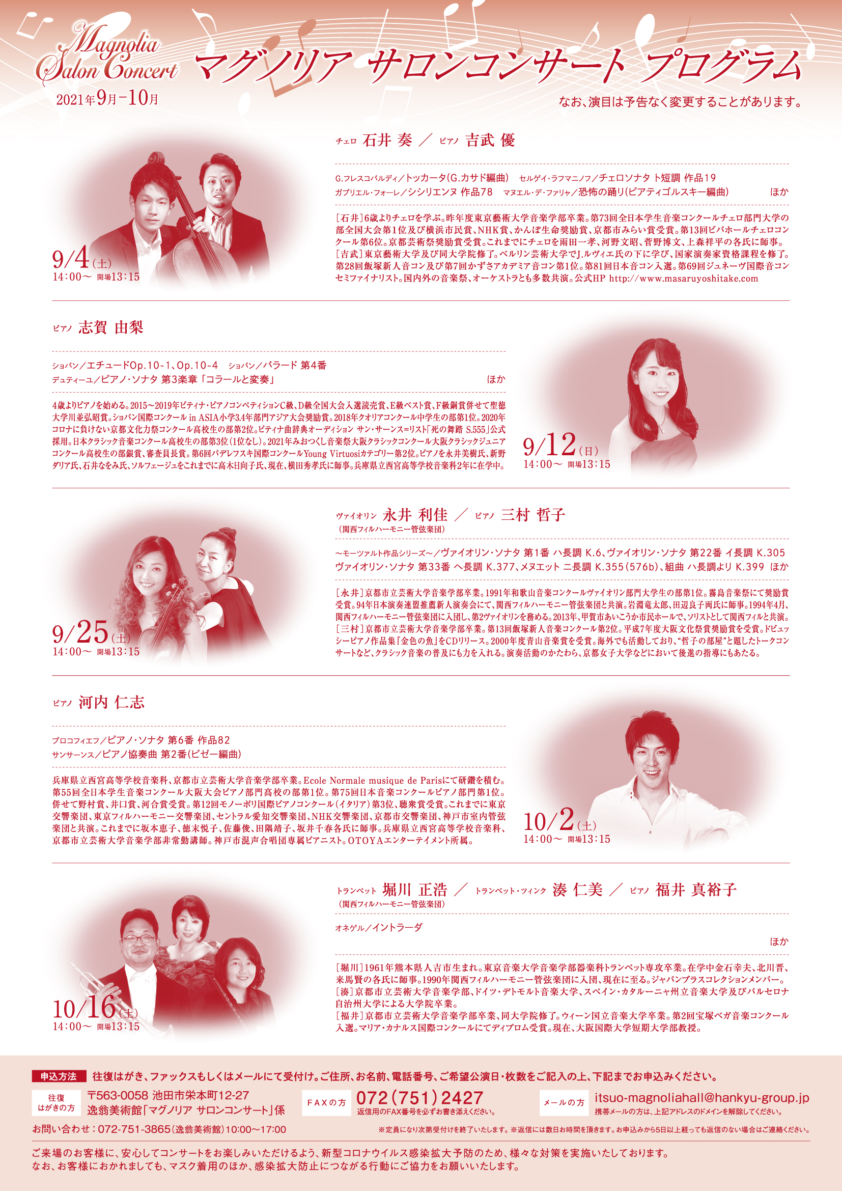 | チケットお申し込み方法 | 氏名・郵便番号・住所・電話番号(FAXの方はFAX番号も)公演名・公演日、枚数をご記入の上、下記までお申込みください。(御電話では受け付けておりません) メール itsuo-magnoliahall@hankyu-group.jp FAX 072-751-2427 往復はがき 〒563-0058 池田市栄本町12-27 阪急文化財団 逸翁美術館「マグノリア・サロンコンサート」係 |