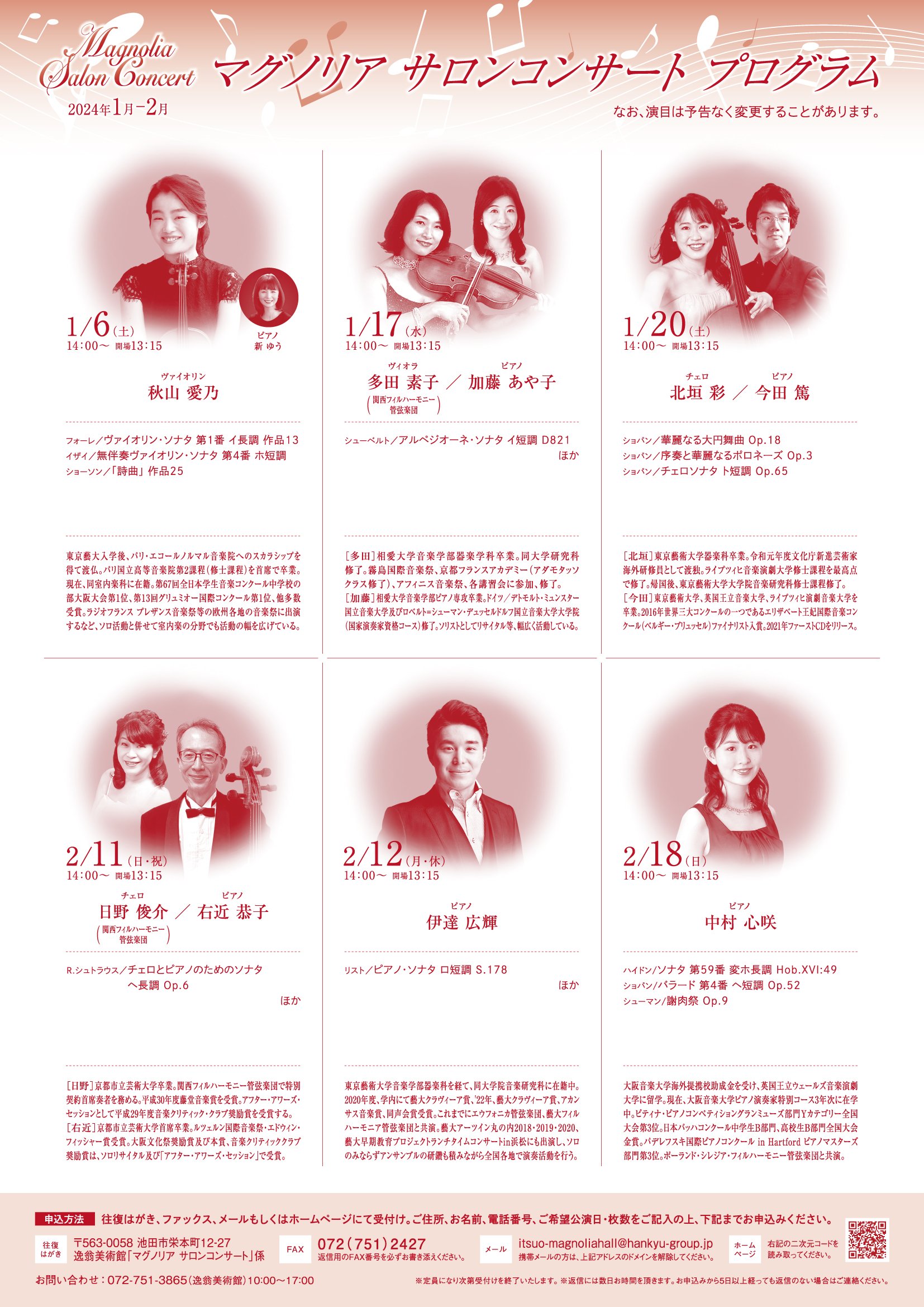 【2024年1月-2月マグノリア サロンコンサート】出演者決定! 2023年11月25日 マグノリアホール Tweet シェアする 2024年1月-2月開催の「マグノリア サロンコンサート」出演者が決定致しました。 詳しくはこちらから↓ /magnolia-hall/concert/salon/ 阪急文化財団